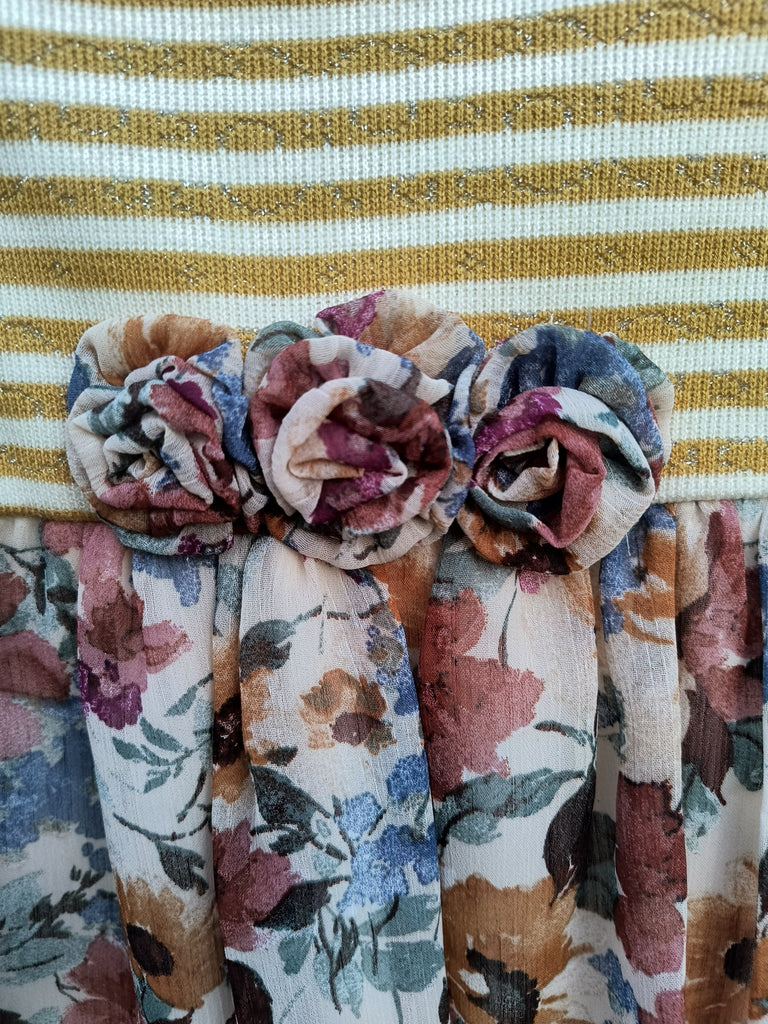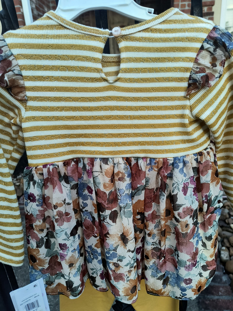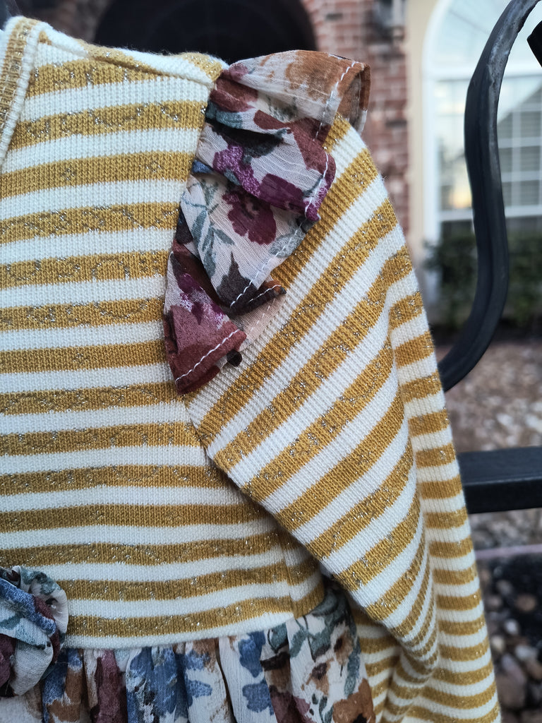 Dress your little one in cozy charm with this Autumn Tunic Legging Set. Featuring mustard leggings paired with a long sleeve tunic with gold glitz stripe dodice and a delicate floral chiffon overlay, this outfit sparkles with rosettes and ruffle trim accents. Perfect for toddlers, it’s a playful and stylish choice that will make fall pictures extra special.