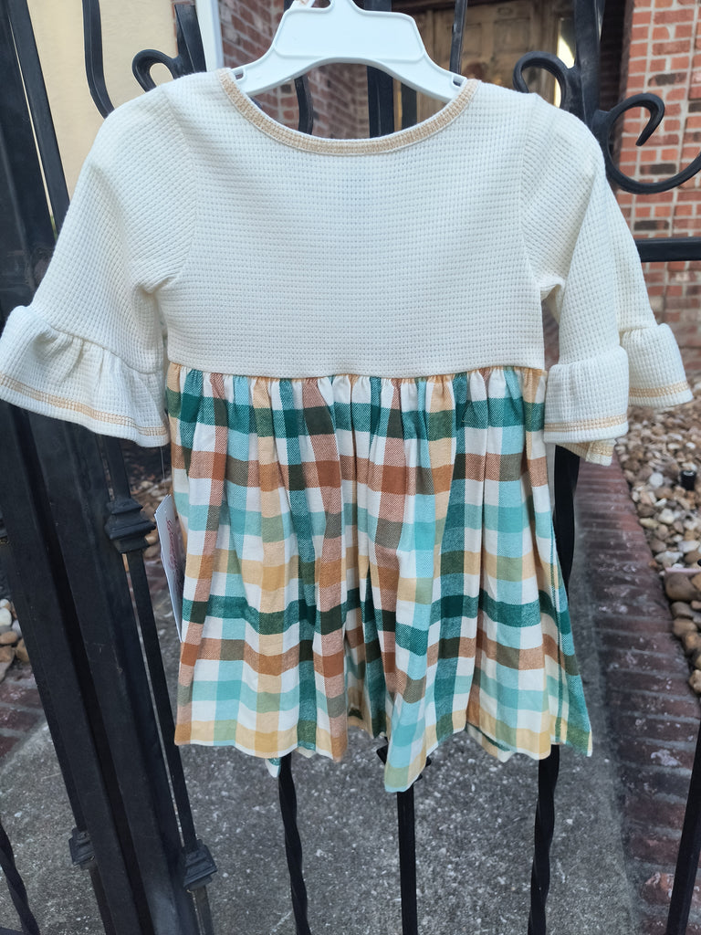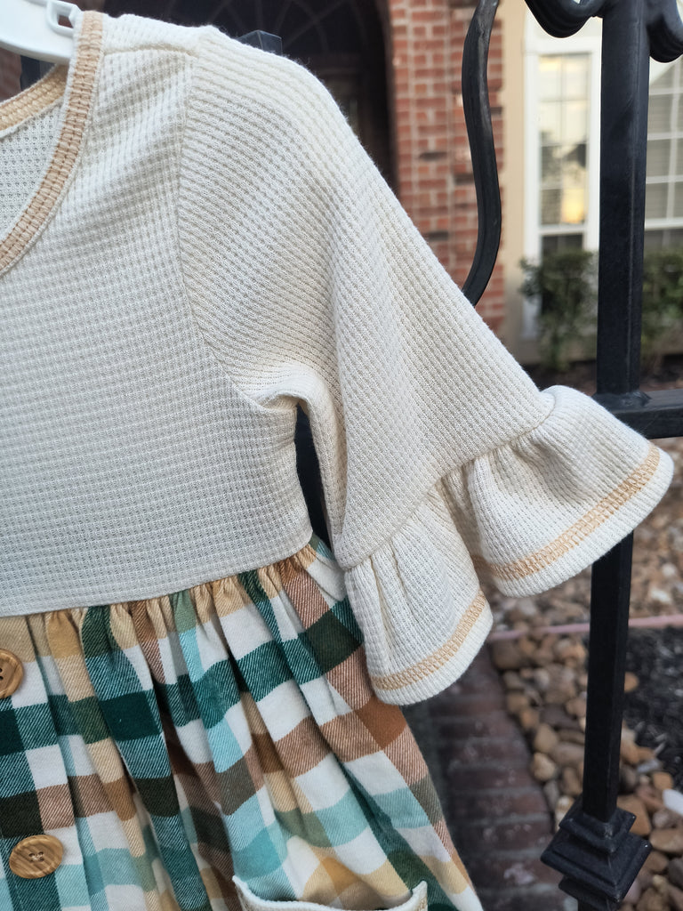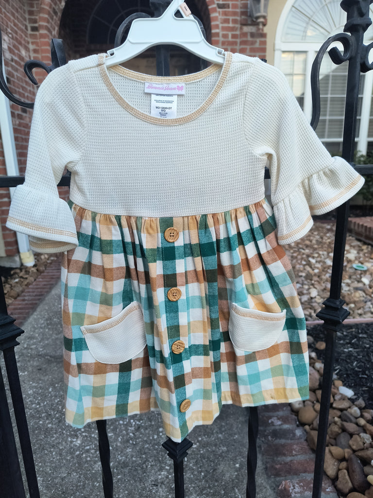 This adorable plaid pocket dress features a charming teal, ivory, and brown pattern perfect for little ones. The ivory waffle knit bodice and sleeves offer cozy comfort, while the three-quarter length sleeves with ruffle hems add a playful touch. Functional ivory waffle knit pockets and delicate buttons complete the look, making it a fun and practical choice for toddlers size 2T to 4T.