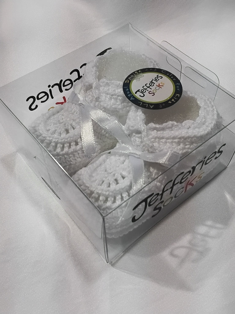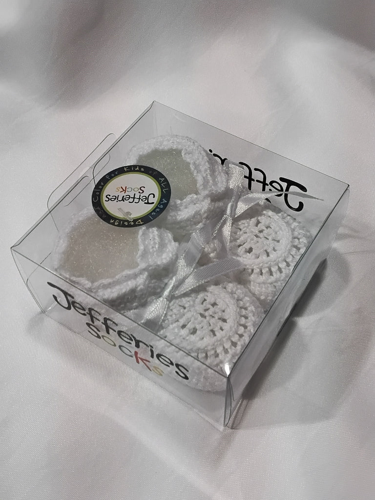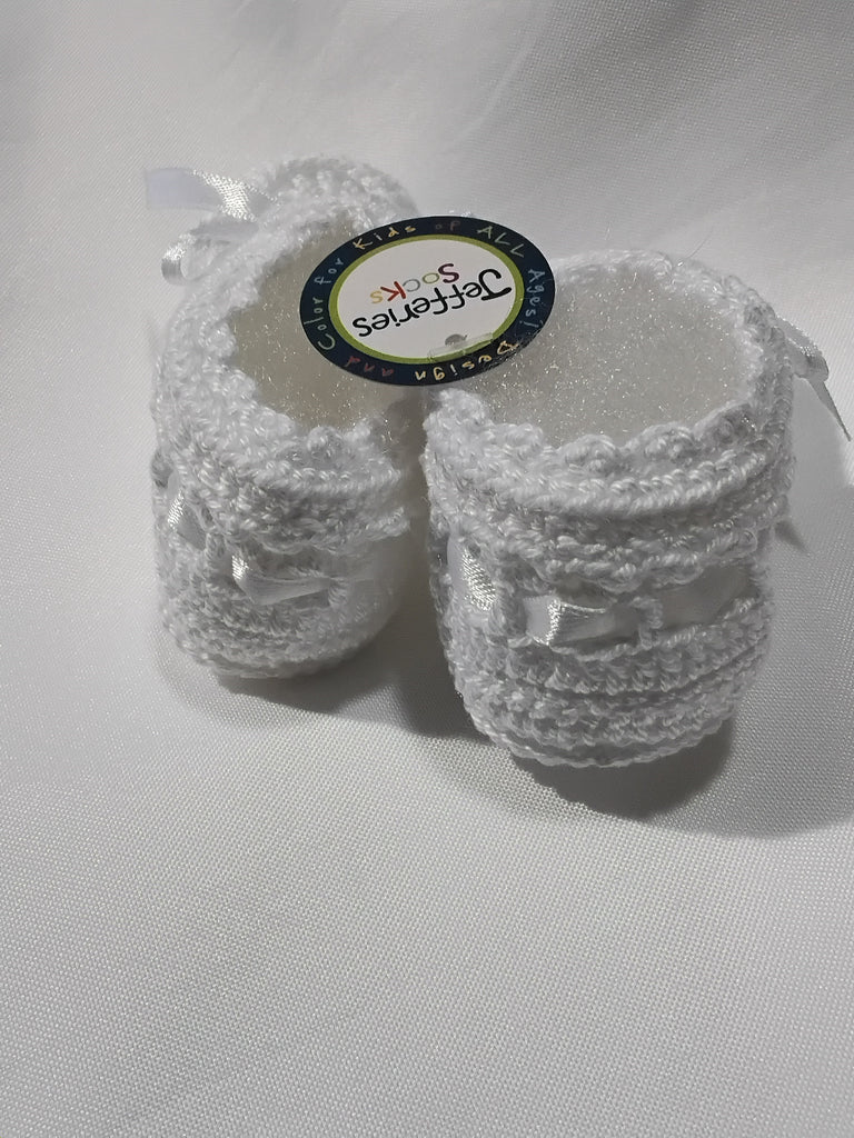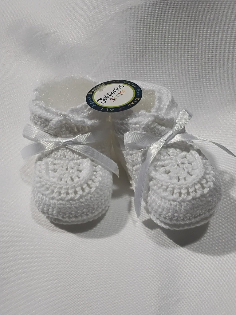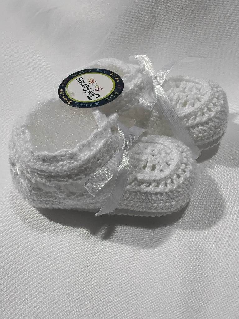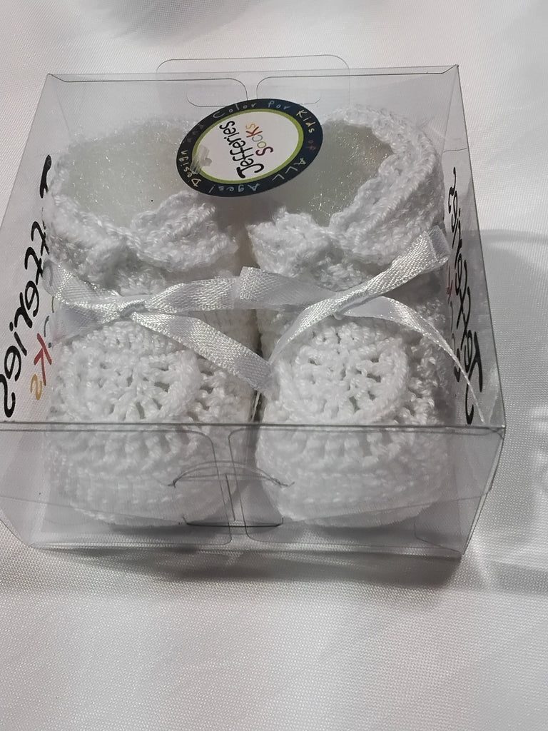 Welcome your little one home in timeless elegance with these handcrafted white crochet booties. Delicately made with soft yarn, they're perfect for newborns of any gender and ideal for special occasions like christenings or take-home photos. Each bootie features a charming white bow detail on top, adding a touch of sweetness to your baby's first days. Gentle on delicate skin and designed with comfort in mind, these booties are a cherished keepsake for milestone moments.