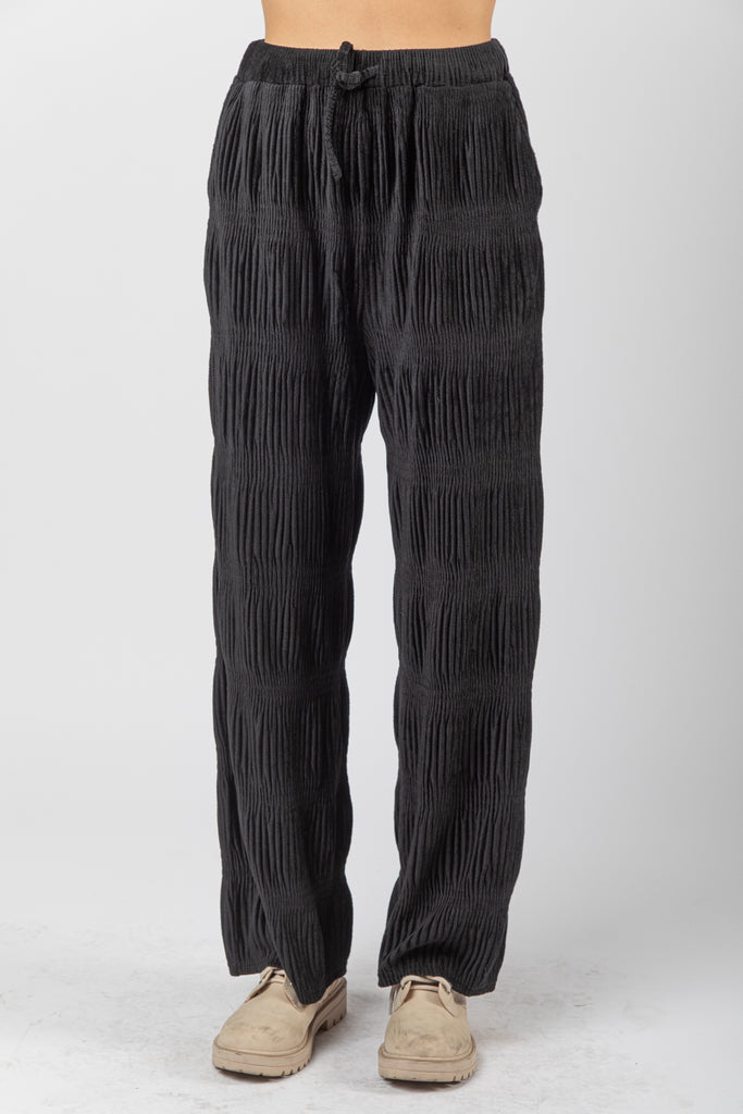 Slip into ultimate comfort with these Olive Pants designed for effortless lounging. Featuring a crinkled soft velvet fabric, an elastic waist with a playful drawstring, and handy side pockets, they blend cozy vibes with functional style. The wide-leg cut ensures free movement while keeping you looking chic from couch to casual outings. Perfect for relaxed days that call for a comfy, stylish touch. Modeled by a 5'9" wearer in size Small. Top available separately